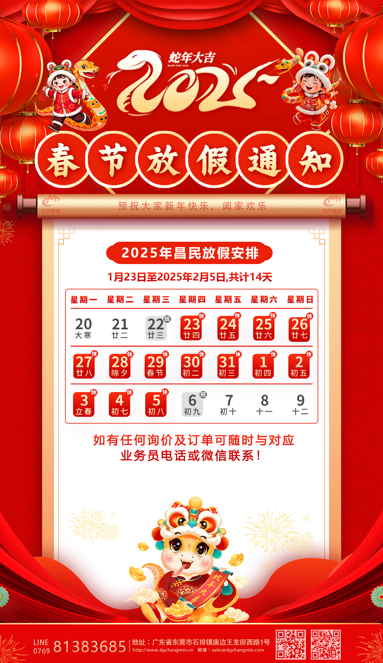 值此新春佳節(jié)來臨之際,為讓大家擁有一個快樂而充實的春節(jié),根據(jù)國家相關(guān)規(guī)定并結(jié)合我司實際情況放假通知安排如下:1月23日至2025年2月5日,共計14天,2025年2月6日開工正式上班。期間,大家可以盡情享受與家人團聚的美好時光,感受濃濃的年味! 在此,昌民全體同仁預(yù)祝大家新春快樂,闔家幸福,萬事如意!最后,再次衷心感謝新老客戶在過去一年里的支持與幫助,讓我們共同期待2025年,大家一起攜手前行,共創(chuàng)輝煌!